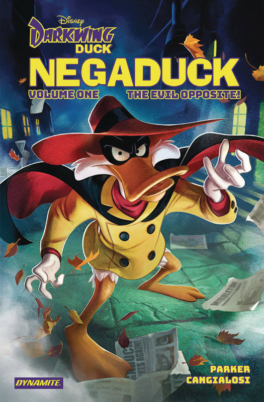 "I am the screeching fingernail on the chalkboard of justice. I am the sour ball in the candy jar of goodness. I am NEGADUCK!" He's the exact opposite of Darkwing Duck in every way... evil, nefarious, dedicated to stealing lollipops from kids and not helping grandmas across the street! And now, he's ready to begin a reign of crime and terror the likes of which St. Canard has never seen -- except... dang it, all of the other villains are ripping off his ideas! What's a criminal mastermind to do when the city's thick with other criminals, stealing his shine? Why, take his villainy on the road, of course! Written with fiendish glee by arch-author JEFF PARKER and illustrated by the suspiciously talented CIRO CANGIALOSI.