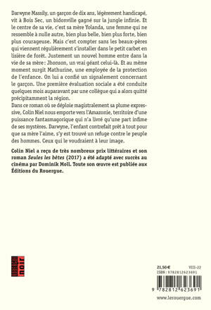 Darwyne Massily, un garçon de dix ans, légèrement handicapé, vit à Bois Sec, un bidonville gagné sur la jungle infinie. Et le centre de sa vie, c'est sa mère Yolanda, une femme qui ne ressemble à nulle autre, bien plus belle, bien plus forte, bien plus courageuse. Mais c'est compter sans les beaux-pères qui viennent régulièrement s'installer dans le petit carbet en lisière de forêt. Justement un nouvel homme entre dans la vie de sa mère : Jhonson, un vrai géant celui-là. Et au même moment surgit Mathurine, une employée de la protection de l'enfance. On lui a confié un signalement concernant le garçon. Une première évaluation sociale a été conduite quelques mois auparavant par une collègue qui a alors quitté précipitamment la région. Dans ce roman où se déploie magistralement sa plume expressive, Colin Niel nous emporte vers l'Amazonie, territoire d'une puissance fantasmagorique qui n'a livré qu'une part infime de ses mystères. Darwyne, l'enfant contrefait prêt à tout pour que sa mère l'aime, s'y est trouvé un refuge contre le peuple des hommes. Ceux qui le voudraient à leur image.
