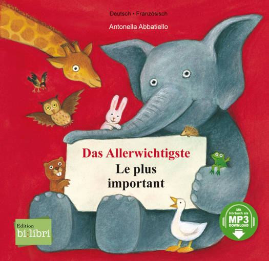 Das Allerwichtigste ist ein zweisprachiges Kinderbuch auf Deutsch und Französisch, ideal für Kinder ab 3 Jahren. Eines Tages unterhalten sich die Tiere im Rotwiesenwald und fragen sich, was wohl das Wichtigste sei. Der Hase legt Wert auf lange Ohren, der Igel erläutert die Vorzüge der Stacheln, die Giraffe setzt auf den langen Hals, der Elefant auf seinen langen Rüssel und so weiter. Doch wie sähen die Tiere aus, wenn jeder Einzelne alle Eigenschaften in sich vereinigte? Die kluge Eule überzeugt ihre tierischen Gesellen, dass jeder individuelle Stärken hat und nicht alle gleich sein können. Das Allerwichtigste erzählt eine wunderbare moderne Fabel über die Einzigartigkeit jedes Einzelnen. Auf jeder Seite der zweisprachigen Geschichte stellt ein Tier seine Besonderheit vor, die es als wichtigste Eigenschaft ansieht. Die nächste Seite - eine Aufklappseite - zeigt dann die Waldbewohner mit der zuvor benannten wichtigsten Eigenschaft (u. a. Frosch und Fuchs mit Stacheln oder Löwe und Giraffe mit Rüssel). Die liebevollen und zum Teil aberwitzigen Illustrationen sorgen bei den Kleinen garantiert für allerlei Gelächter. Die Hörversion der Geschichte wurde von Muttersprachlern gelesen und ist als kostenloser MP3-Download (mit Zugangscode im Buch) verfügbar.Das Buch ist in weiteren Sprachfassungen - immer in Kombination mit Deutsch - erhältlich.