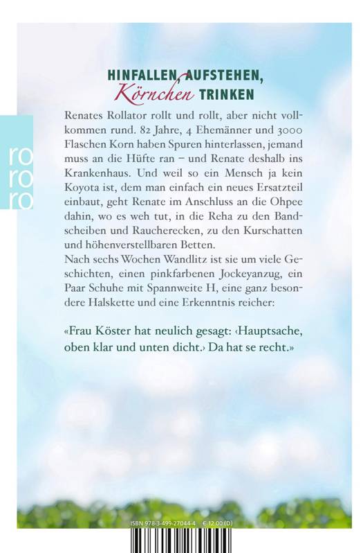 Renates Rollator rollt und rollt, aber nicht vollkommen rund: 82 Jahre, 4 Ehemänner und 3000 Flaschen Korn haben Spuren hinterlassen, jemand muss an die Hüfte ran - und Renate deshalb ins Krankenhaus. Und weil so ein Mensch ja kein Koyota ist, dem man einfach ein neues Ersatzteil einbaut, geht Renate im Anschluss an die Ohpee dahin, wo es wehtut, zu den Bandscheiben und Raucherecken, zu den Kurschatten und höhenverstellbaren Betten: In die Reha, die sie kurzerhand zur Kur erklärt und rockt. Nach sechs Wochen Wandlitz ist sie um viele Geschichten, einen pinkfarbenen Jockeyanzug, ein paar Schuhe mit Spannweite H, eine ganz besondere Halskette und eine Erkenntnis reicher: