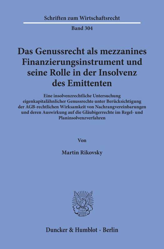Mezzanine Finanzierungsinstrumente ermoglichen es durch Aufnahme von Fremdmitteln bilanzielles und aufsichtsrechtliches Eigenkapital zu schopfen. Unter den mezzaninen Instrumenten sticht das Genussrecht hervor, das wegen seiner groaen inhaltlichen Gestaltungsfreiheit fur Unternehmen mit Eigenkapitalbedarf besonders attraktiv ist. Mit den Insolvenzen der Prokon Regenerative Energien GmbH und der Infinus AG (beide 2014), die als Finanzskandale mit Milliardenschaden wahrgenommen wurden, ruckten Genussrechte in das Bewusstsein der Offentlichkeit. Der Autor untersucht neue sowie bis dahin ungeklarte Rechtsfragen in den verschiedenen Phasen des Insolvenzverfahrens, die vor allem mit der freiwilligen Subordination der Genussverbindlichkeiten einhergehen. Dabei geht er der Frage nach, ob Genussrechtsinhaber im Insolvenzverfahren eine faktische Gesellschafterstellung einnehmen, obwohl ihnen keine gesellschafterahnlichen Rechte eingeraumt wurden. Zudem wird die AGB-rechtliche Wirksamkeit von Nachrangvereinbarungen und der sogenannten vorinsolvenzlichen Durchsetzungssperre ausfuhrlich beleuchte