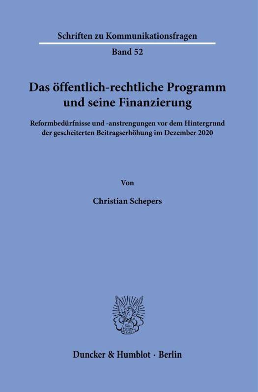 English summary: The Public Broadcasting Programme and its Financing The thesis examines which reforms are necessary to adapt the structure and programme of public service broadcasting to the changing needs and interests of society and compares them with the reform according to the Third Media Amendment Treaty and other reform proposals. In this context, the reform of the contribution assessment towards an indexation model is also to be reviewed. German description: Es sind vorwiegend die Burger, die den offentlich-rechtlichen Rundfunk und sein Programm mit Beitragen finanzieren. Die Pflicht zur Entrichtung einer Geldleistung ergibt sich aus dem Gesetz. Die Debatte um Programm, Struktur und Finanzierung des offentlich-rechtlichen Rundfunks entzundet sich daher in verlasslicher Regelmassigkeit an anstehenden Beitragserhohungen. Im Dezember 2020 scheiterte die Beitragserhohung am Veto Sachsen-Anhalts. Der Vorgang war Anstoss fur Reformbestrebungen, die in der Reform des Programmauftrags mundeten. Die Arbeit untersucht, welcher Reformen es bedarf, um das offentlich-rechtliche Programm in Struktur und Inhalt an die sich wandelnden Bedurfnisse und Interessen der Gesellschaft anzupassen und stellt sie der Reform des Programmauftrags nach dem Dritten Medienanderungsstaatsvertrag sowie weiteren Reformvorschlagen gegenuber. Hierbei kommt auch das Verfahren zur Festsetzung des Rundfunkbeitrags hin zu einem Indexierungsmodell auf den Prufstand.