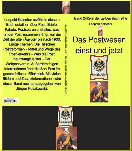 Leopold Katscher erzählt in diesem Buch detailliert über Post, Briefe, Pakete, Postsparen und alles, was mit der Post zusammenhängt von der Zeit der alten Ägypter bis nach 1900. Einige Themen: Die Hillschen Postreformen – Mittel und Wege des Postverkehrs – Was die Post heutzutage leistet – Der Weltpostverein. Außerdem folgen Informationen über die See-Post im geschichtlichen Rückblick. Mit vielen Bildern und Zusatzinformationen wird dieser Band neu herausgegeben von Jürgen Ruszkowski. – Rezession: Ich bin immer wieder begeistert von der "Gelben Buchreihe". Die Bände reißen einen einfach mit. Inzwischen habe ich ca. 20 Bände erworben und freue mich immer wieder, wenn ein neues Buch erscheint. oder: Sämtliche von Jürgen Ruszkowski aus Hamburg herausgegebene Bücher sind absolute Highlights. Dieser Band macht da keine Ausnahme. Sehr interessante und abwechslungsreiche Themen aus verschiedenen Zeit-Epochen, die mich von der ersten bis zur letzten Seite gefesselt haben! Man kann nur staunen, was der Mann in seinem Ruhestand schon veröffentlicht hat. Alle Achtung!