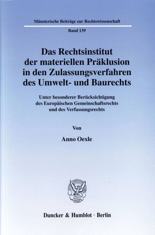 Basierend auf einer soliden dogmatischen Einordnung der materiellen Präklusion verfolgt Anno Oexle das Ziel, alle Rechtsfragen dieses Instituts von Grund auf zu überdenken. Besondere Aufmerksamkeit wird dabei der gemeinschaftsrechtlichen Problematik gewidmet.