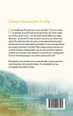 De twaalfjarige M. groeit op in twee werelden. Thuis is er chaos en geweld, op school past ze zich geruisloos aan. Haar ouders zijn continu op de vlucht – voor de buitenwereld, elkaar, hun eigen demonen – en sleuren M. mee, van dorp naar dorp, van school naar school. Ze zoekt haar heil in de natuur en bij andere buitenstaanders – de bewoners van een vakantiepark, de reizigers in een woonwagenkamp, een groep kunstenaars in het bos. Maar nergens krijgt ze de kans om wortel te schieten, of, belangrijker nog: om met iemand een gedeeld verleden op te bouwen. Voor iedereen is ze slechts een voorbijganger. En als er niemand getuige is van je leven, besta je dan wel? Dat beloof ik is het verhaal van een meisje dat alles in haar jonge leven moet bevechten om overeind te blijven. En uiteindelijk voor een onmogelijke keuze komt te staan.