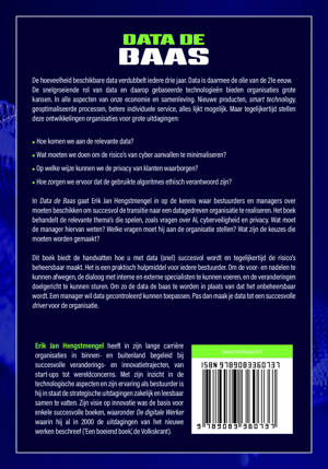 In Data de Baas gaat Erik Jan Hengstmengel in op de kennis waar bestuurders en managers over moeten beschikken om succesvol de transitie naar een datagedreven organisatie te realiseren. Het boek behandelt de relevante thema’s die spelen, zoals vragen over AI, cyberveiligheid en privacy. Wat moet de manager hiervan weten? Welke vragen moet hij aan de organisatie stellen? Wat zijn de keuzes die moeten worden gemaakt?