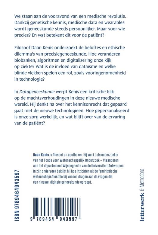 In Datageneeskunde werpt Kenis een kritische blik op de machtsverhoudingen in deze nieuwe medische wereld. Hij denkt na over het kennisonrecht dat gepaard gaat met de nieuwe technologieën. Hoe gepersonaliseerd is onze zorg werkelijk, en wat blijft over van de ervaring van de patiënt?