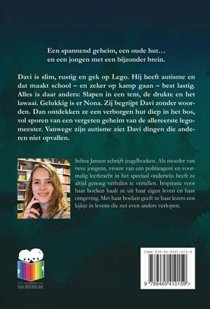 Davi is slim, rustig en gek op Lego. Hij heeft autisme en dat maakt school – en zeker op kamp gaan – best lastig. Alles is daar anders: Slapen in een tent, de drukte en het lawaai. Gelukkig is er Nona. Zij begrijpt Davi zonder woorden. Dan ontdekken ze een verborgen hut diep in het bos, vol sporen van een vergeten geheim van de allereerste legomeester. Vanwege zijn autisme ziet Davi dingen die anderen niet opvallen.