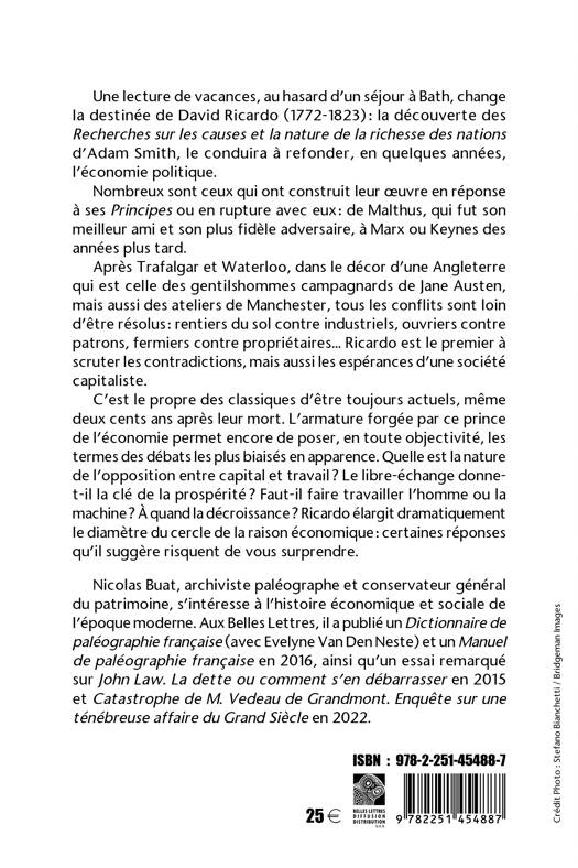 Une lecture de vacances, au hasard d'un sejour a Bath, change la destinee de David Ricardo (1772-1823): la decouverte des Recherches sur les causes et la nature de la richesse des nations d'Adam Smith, le conduira a refonder, en quelques annees, l'economie politique. Nombreux sont ceux qui ont construit leur oeuvre en reponse a ses Principes ou en rupture avec eux: de Malthus, qui fut son meilleur ami et son plus fidele adversaire, a Marx ou Keynes des annees plus tard. Apres Trafalgar et Waterloo, dans le decor d'une Angleterre qui est celle des gentilshommes campagnards de Jane Austen, mais aussi des ateliers de Manchester, tous les conflits sont loin d'etre resolus: rentiers du sol contre industriels, ouvriers contre patrons, fermiers contre proprietaires Ricardo est le premier a scruter les contradictions, mais aussi les esperances d'une societe capitaliste. C'est le propre des classiques d'etre toujours actuels, meme deux cents ans apres leur mort. L'armature forgee par ce prince de l'economie permet encore de poser, en toute objectivite, les termes des debats les plus biaises en apparence. Quelle est la nature de l'opposition entre capital et travail ? Le libre-echange donnet- il la cle de la prosperite ? Faut-il faire travailler l'homme ou la machine ? A quand la decroissance ? Ricardo elargit dramatiquement le diametre du cercle de la raison economique: certaines reponses qu'il suggere risquent de vous surprendre.