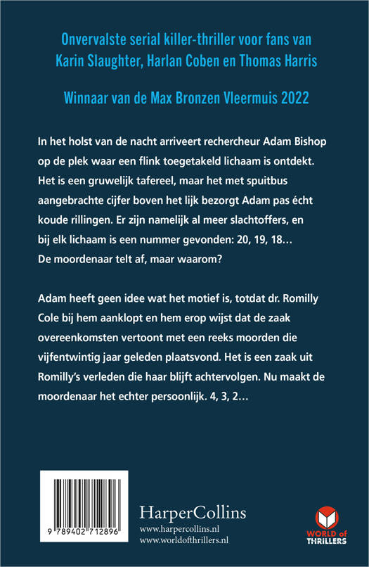 In het holst van de nacht arriveert rechercheur Adam Bishop op de plek waar een flink toegetakeld lichaam is ontdekt. Het is een gruwelijk tafereel, maar het met spuitbus aangebrachte cijfer boven het lijk bezorgt Adam pas écht koude rillingen. Er zijn namelijk al meer slachtoffers, en bij elk lichaam is een nummer gevonden: 20, 19, 18… De moordenaar telt af, maar waarom?