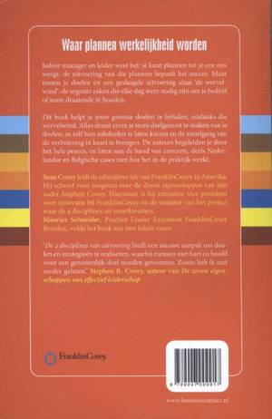 Iedere manager en leider weet het: je kunt plannen tot je een ons weegt, de uitvoering van die plannen bepaalt het succes. Maar tussen je doelen en een geslaagde uitvoering staat 'de wervelwind': de urgente zaken die elke dag weer nodig zijn om je bedrijf of team draaiende te houden. Dit boek helpt je jouw grootse doelen te behalen, ondanks die wervelwind. Alles draait erom je team deelgenoot te maken van je doelen, ze zelf hun subdoelen te laten kiezen en de voortgang van de verbetering in kaart te brengen. De auteurs begeleiden je door het hele proces, en laten aan de hand van concrete, deels Nederlandse en Belgische cases zien hoe het in de praktijk werkt. Sean Covey leidt de educatieve tak van FranklinCovey in Amerika. Hij schreef voor jongeren over de Zeven eigenschappen van zijn vader Stephen Covey. Daarnaast is hij executive vice president voor innovatie bij FranklinCovey en de initiator van het project waar de 4 disciplines uit voortkwamen. Maurice Schneider, Practice Leader Execution FranklinCovey Benelux, vulde het boek aan met lokale cases.