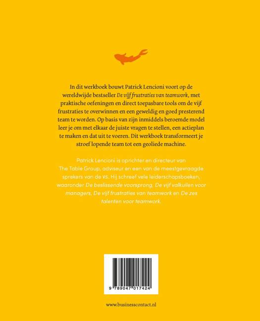 In dit werkboek bouwt Patrick Lencioni voort op de wereldwijde bestseller De vijf frustraties van teamwork, met praktische oefeningen en direct toepasbare tools om de vijf frustraties te overwinnen en een geweldig en goed presterend team te worden. Op basis van zijn inmiddels beroemde model leer je om met elkaar de juiste vragen te stellen, een actieplan te maken en dat uit te voeren. Dit werkboek transformeert je stroef lopende team tot een geoliede machine.