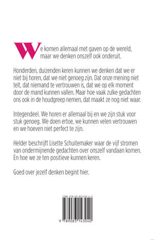 Goed over jezelf denken begint hier. We komen allemaal met gaven op de wereld, maar we denken onszelf ook onderuit. Honderden, duizenden keren kunnen we denken dat we er niet bij horen, dat we niet genoeg zijn. Dat onze mening niet telt, dat niemand te vertrouwen is en dat we op elk moment door de mand kunnen vallen. Maar hoe vaak zulke gedachten ons ook in de houdgreep nemen, dat maakt ze nog niet waar. Integendeel, we horen er allemaal bij en we zijn stuk voor stuk genoeg. We doen ertoe, we kunnen velen vertrouwen en we hoeven niet perfect te zijn. Helder beschrijft Lisette Schuitemaker waar de vijf stromen van ondermijnende gedachten over onszelf vandaag komen. En hoe we ze ten positieve kunnen keren.
