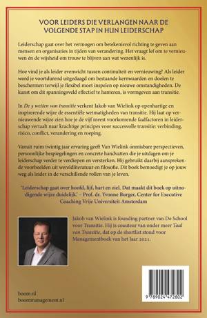 In De 5 wetten van transitie verkent Jakob van Wielink op openhartige en inspirerende wijze de essentiële wetmatigheden van transitie. Hij laat op vernieuwende wijze zien hoe je de vijf meest voorkomende faalfactoren in leiderschap vertaalt naar krachtige principes voor succesvolle transitie: verbinding, risico, conflict, verandering en roeping.