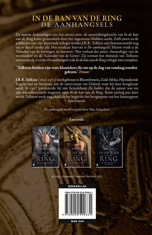 De meeste deskundigen zijn het er over eens: de aantrekkingskracht van In de ban van de ring komt grotendeels door de diepgang van Midden-aarde. Zelfs jaren na publicatie van zijn beroemde trilogie werkte J.R.R. Tolkien zijn fantasiewereld nog tot in het detail verder uit. Het resultaat hiervan is De aanhangsels. Hierin vindt u de ‘Annalen van de koningen en heersers’, ‘Het verhaal der jaren: chronologie van de westlanden’ en de ‘Kalender van de Gouw’. Zij vormen het sluitstuk van Tolkiens meesterwerk.René van Rossenberg, al jaren lang Nederlands bekendste Tolkiendeskundige, schreef speciaal voor deze uitgave een schets van het leven en werk van Tolkien, de stamvader van het fantasygenre. Zonder De aanhangsels is de In de ban van de ring-trilogie niet compleet.