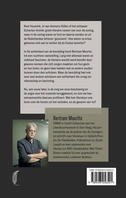 Roel Houwink, Jo van Ammers-Küller of het echtpaar Scharten-Antink: grote literaire namen van voor de oorlog, maar in de oorlog waren ze fout en daarna werden ze uit de Nederlandse letteren ‘gezuiverd’. Hoe waren ze ertoe gekomen zich aan te sluiten bij de Duitse bezetter? In De achterkant van de bevrijding komt Bertram Mourits tot een nuchtere vaststelling. Lang niet allemaal waren ze volbloed fascisten, de literaire wereld werd bevolkt door gewone mensen die zich zorgen maakten om hun gezin en hun leven, en geen idee hadden wat ze anders zouden kunnen doen dan schrijven. Maar de bevrijding had ook voor veel andere schrijvers een achterkant die vroeg om rekenschap en bezinning. Nu, een eeuw later, is de zorg om onze beschaving en de angst voor het vreemde teruggekeerd, en zien we hoe extreemrechts daarvan profiteert. Wat kan literatuur ons leren over de fouten uit het verleden, en de gevaren van nu?