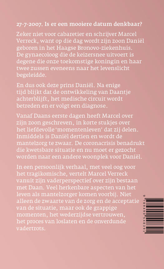 27-7-2007. Is er een mooiere datum denkbaar? Zeker niet voor cabaretier en schrijver Marcel Verreck, want op die dag wordt zijn zoon Daniël geboren in het Haagse Bronovo-ziekenhuis. De gynaecoloog die de keizersnee uitvoert is degene die onze toekomstige koningin en haar twee zussen eveneens naar het levenslicht begeleidde. En dus ook deze prins Daniël. Na enige tijd blijkt dat de ontwikkeling van Daantje achterblijft, het medische circuit wordt betreden en er volgt een diagnose. Vanaf Daans eerste dagen heeft Marcel over zijn zoon geschreven, in korte stukjes over het liefdevolle ‘momentenleven’ dat zij delen. Inmiddels is Daniël dertien en wordt de mantelzorg te zwaar. De coronacrisis benadrukt die kwetsbare situatie en nu moet er gezocht worden naar een andere woonplek voor Daniël. In een persoonlijk verhaal, met veel oog voor het tragikomische, vertelt Marcel Verreck vanuit zijn vaderperspectief over zijn bestaan met Daan. Veel herkenbare aspecten van het leven als mantelzorger komen voorbij. Niet alleen de zwaarte van de zorg en de acceptatie van de situatie, maar ook de grappige momenten, het wederzijdse vertrouwen, het proces van loslaten en de onverdunde vadertrots.