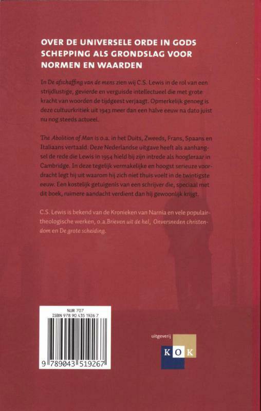 In De afschaffing van de mens zien wij C.S. Lewis in de rol van een strijdlustige, gevierde en verguisde intellectueel die met grote kracht van woorden de tijdgeest verjaagt. Opmerkelijk genoeg is deze cultuurkritiek uit 1943 meer dan een halve eeuw na dato juist nu nog steeds actueel.