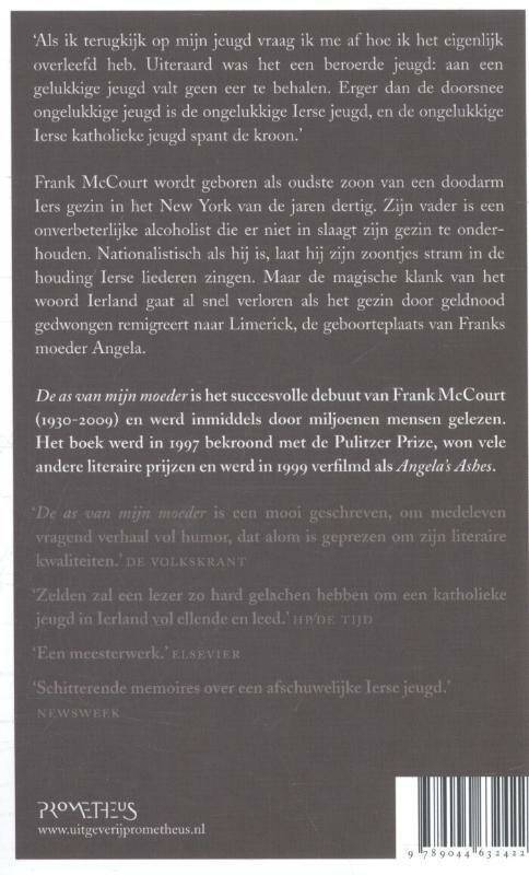 Frank McCourt (1930-2009) maakte zijn debuut met het inmiddels door miljoenen gelezen De as van mijn moeder, dat in 1997 werd bekroond met de Pulitzer Prize, vele andere literaire prijzen won en in 1999 werd verfilmd als Angela’s Ashes. Later schreef hij de romans De nieuwe wereld en Meester!