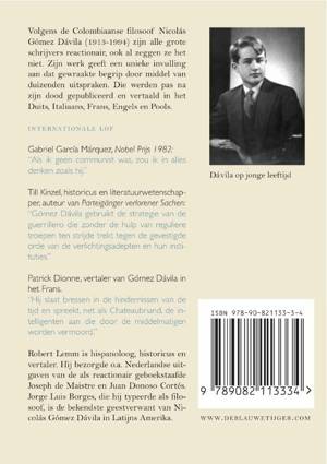 Volgens de Colombiaanse filosoof Nicolas Gomez Davila (1913-1994) zijn alle grote schrijvers reactionair, ook al zeggen ze het niet. Zijn werk geeft een unieke invulling aan dat gewraakte begrip door middel van duizenden uitspraken. Die werden pas na zijn dood gepubliceerd en vertaald in het Duits, Italiaans, Frans, Engels en Pools.