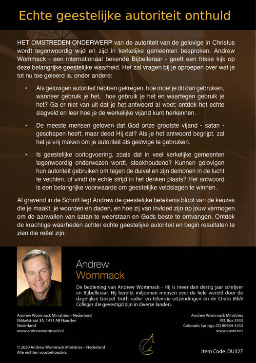 Het omstreden onderwerp van de autoriteit van de gelovige in Christus wordt tegenwoordig wijd en zijd in kerkelijke gemeenten besproken. Andrew Wommack geeft een frisse kijk op deze belangrijke geestelijke waarheid. Het zal vragen bij je oproepen over wat je tot nu toe geleerd is, onder andere: