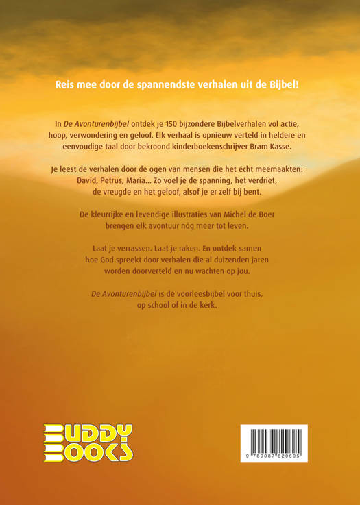 Stap in de wereld van De Avonturenbijbel en beleef de spannendste verhalen uit de Bijbel zoals nooit tevoren! Bekroond kinderboekenschrijver Bram Kasse brengt deze tijdloze verhalen tot leven in taal die jong en oud raakt. Perfect voor kinderen die de Bijbel willen ontdekken – en voor ouders die samen met hen op avontuur willen gaan. De prachtige illustraties van Michel de Boer, meester in kinderboekenillustraties, maken elk verhaal nog levendiger. Samen hebben zij een kinderbijbel gecreëerd die je niet alleen wilt lezen, maar keer op keer wilt herbeleven.