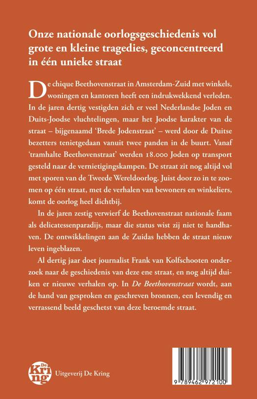 Al dertig jaar doet journalist Frank van Kolfschooten onderzoek naar de geschiedenis van de chique Beethovenstraat in Amsterdam-Zuid. De belangrijkste winkelstraat uit het Plan Zuid van Berlage heeft een indrukwekkend verleden, en nog altijd duiken er nieuwe verhalen op. In de jaren dertig vestigden zich er veel Nederlandse Joden en Duits-Joodse vluchtelingen, maar het Joodse karakter van de straat – bijgenaamd ‘Brede Jodenstraat’ – werd door de Duitse bezetters tenietgedaan vanuit twee panden in de buurt. Vanaf ‘tramhalte Beethovenstraat’ werden 18.000 Joden op transport gesteld naar de vernietigingskampen. De straat zit nog altijd vol met sporen van de Tweede Wereldoorlog. Juist door zo in te zoomen op één straat, met de verhalen van bewoners en winkeliers, komt de oorlog heel dichtbij. In de jaren zestig verwierf de Beethovenstraat nationale faam als delicatessenparadijs, maar die status wist zij niet te handhaven. De ontwikkelingen aan de Zuidas hebben de straat nieuw leven ingeblazen. In DE BEETHOVENSTRAAT wordt, aan de hand van gesproken en geschreven bronnen, een levendig en verrassend beeld geschetst van deze beroemde straat.