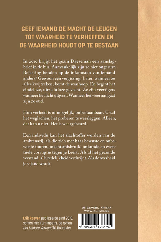 In 2010 krijgt het gezin Daeseman een aanslagbrief in de bus. Aanvankelijk zijn ze niet ongerust. Belasting betalen op de inkomsten van iemand anders? Gewoon een vergissing. Later, wanneer ze alles kwijtraken, komt de wanhoop. En begint het eindeloze, uitzichtloze gevecht. Ze zijn veertigers wanneer het licht uitgaat. Wanneer het weer aangaat zijn ze oud.