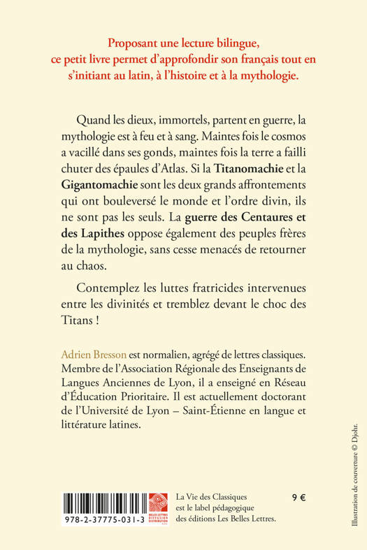 Quand les dieux, immortels, partent en guerre, la mythologie est à feu et à sang. Maintes fois le cosmos a vacillé dans ses gonds, maintes fois la terre a failli chuter des épaules d’Atlas. Si la Titanomachie et la Gigantomachie sont les deux grands affrontements qui ont bouleversé le monde et l’ordre divin, ils ne sont pas les seuls. La guerre des Centaures et des Lapithes oppose également des peuples frères de la mythologie, sans cesse menacés de retourner au chaos.
