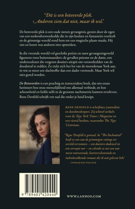 Rene Denfeld schrijft licht in het donkerste duister De betoverde plek is een oude stenen gevangenis, gezien door de ogen van een terdoodveroordeelde die in zijn boeken en fantasieën overleeft en de grimmige wereld rond hem tot een magische plaats maakt. Hij ziet en hoort wat anderen niet opmerken. In die vreemde wereld vol geschifte poëzie en rauw gevangenisgeweld figureren twee buitenstaanders: de gevallen priester en de dame, een onderzoekster die vergeten dossiers uitspit om veroordeelden van de doodstraf te redden. Ze trekt zich het lot van de moordenaar York aan, in wie ze meer een slachtoffer dan een dader vermoedt. Maar York wil niet gered worden. De Betoverden is een prachtig en transcendent boek, dat ons eraan herinnert hoe onze menselijkheid ons allemaal verbindt, en hoe schoonheid en liefde zelfs in de grootste nachtmerrie kunnen overleven. Rene Denfeld schrijft een taal die onder je huid kruipt.