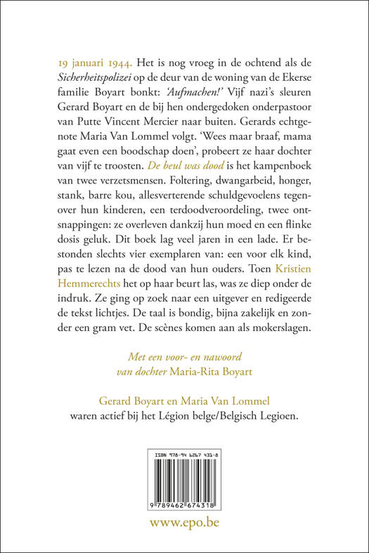 19 januari 1944. Het is nog vroeg in de ochtend als de Sicherheitspolizei op de deur van de woning van de Ekerse familie Boyart bonkt: ‘Aufmachen!’ Vijf nazi’s sleuren Gerard Boyart en de bij hen ondergedoken onderpastoor van Putte Vincent Mercier naar buiten. Gerards echtgenote Maria Van Lommel volgt. ‘Wees maar braaf, mama gaat even een boodschap doen,’ probeert ze haar dochter van vijf te troosten. 'De beul was dood' is het kampenboek van twee jonge verzetsmensen. Foltering, dwangarbeid, honger, stank, barre kou, allesverterende schuldgevoelens tegenover hun kinderen, een terdoodveroordeling, twee ontsnappingen: ze overleven dankzij hun moed en een flinke dosis geluk. Dit boek lag veel jaren in een lade. Er bestonden slechts vier exemplaren van: een voor elk kind, pas te lezen na de dood van hun ouders. Toen Kristien Hemmerechts het op haar beurt las, was ze diep onder de indruk. Ze ging op zoek naar een uitgever en redigeerde de tekst lichtjes. De taal is bondig, bijna zakelijk en zonder een gram vet. De scènes komen aan als mokerslagen.