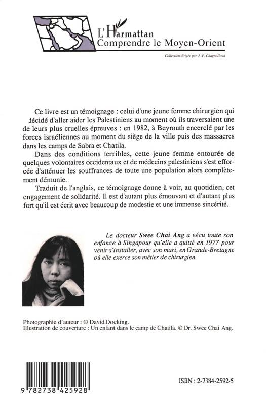 L'auteur, chirurgienne originaire de Singapour, a décidé d'aller aider les Palestiniens de Beyrouth, en 1982, lors du siège de la ville par les forces israëliennes, puis des massacres dans les camps de Sabra et Chatila. Son témoignage.