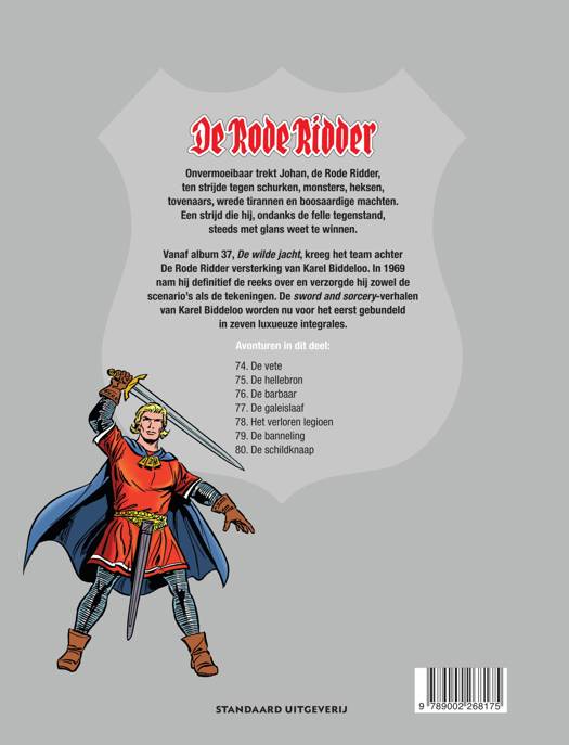 Onvermoeibaar trekt Johan, de Rode Ridder, ten strijde tegen schurken, monsters, heksen, tovenaars, wrede tirannen en boosaardige machten. Een strijd die hij, ondanks de felle tegenstand, steeds met glans weet te winnen. Vanaf album 37, De wilde jacht, kreeg het team achter De Rode Ridder versterking van Karel Biddeloo. In 1969 nam hij definitief de reeks over en verzorgde hij zowel de scenario's als de tekeningen. Deze integrale bevat: De Vete, De Hellebron, De Barbaar, De Galeislaaf, Het Verloren Legioen, De Banneling en De schildknaap.