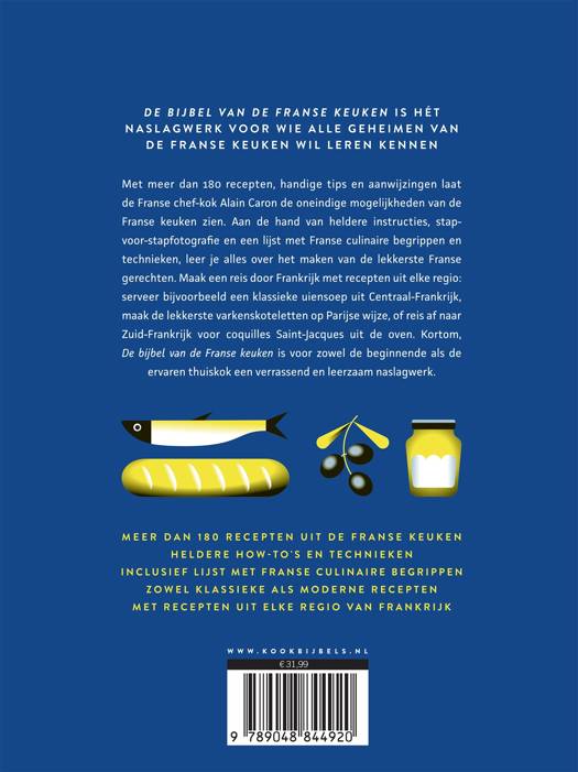 Met meer dan 180 recepten, handige tips en aanwijzingen laat de Franse chef-kok Alain Caron de oneindige mogelijkheden van de Franse keuken zien. Aan de hand van heldere instructies, stap-voor-stapfotografie en een lijst met Franse culinaire begrippen en technieken, leer je alles over het maken van de lekkerste Franse gerechten. Maak een reis door Frankrijk met recepten uit elke regio: serveer bijvoorbeeld een klassieke uiensoep uit Centraal-Frankrijk, maak de lekkerste varkenskoteletten op Parijse wijze, of reis af naar Zuid-Frankrijk voor coquilles Saint-Jacques uit de oven. Kortom, De bijbel van de Franse keuken is voor zowel de beginnende als de ervaren thuiskok een verrassend en leerzaam naslagwerk.