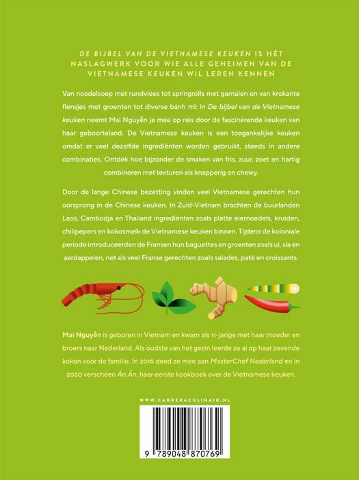 Van noedelsoep met rundvlees tot springrolls met garnalen en van krokante flensjes met groenten tot diverse bánh mì: in De bijbel van de Vietnamese keuken neemt Mai Nguyen je mee op reis door de fascinerende keuken van haar geboorteland. De Vietnamese keuken is een toegankelijke keuken omdat er veel dezelfde ingrediënten worden gebruikt, steeds in andere combinaties. Ontdek hoe bijzonder de smaken van fris, zuur, zoet en hartig combineren met texturen als knapperig en chewy.
