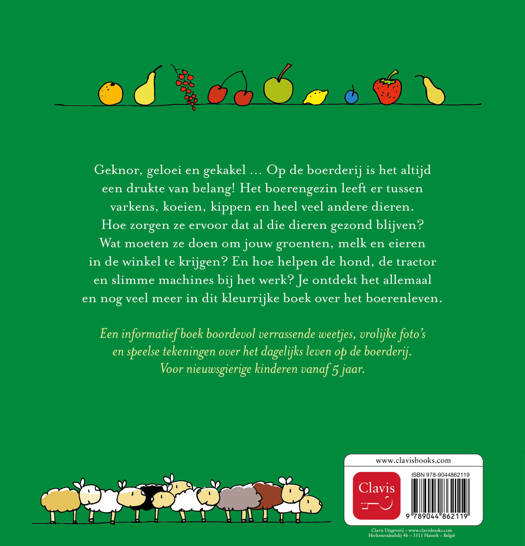 Geknor, geloei en gekakel … Het is erg druk op de boerderij! Het boerengezin woont er samen met varkens, koeien, kippen en heel veel andere dieren. Weet jij wat erbij komt kijken om zoveel dieren te verzorgen? Wat moet het boerengezin doen om jouw groenten, melk en eieren in de winkelrekken te krijgen? En hoe kunnen slimme machines en drones hen daarbij helpen? Je leest het allemaal en nog veel meer in dit kleurrijke boek over het boerenleven.