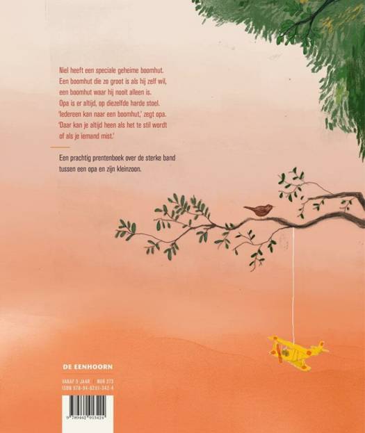 Hartverwarmend prentenboek-debuut. Over een jongen die zijn opa niet kan vergeten. De gevoelige potlood-illustraties brengen het bos en Niels fantasie tot leven. Vanaf 5 jaar. Ga op avontuur met Niel in een wereld vol verrassingen, met een heel bijzondere ontmoeting. Niel heeft een speciale geheime boomhut. Een boomhut waar hij niet meer alleen is. Opa zit er altijd, op die harde stoel, nooit op de zachte bank. Samen maken ze de beste kampvuren van het bos. ‘Je kan hier altijd heenkomen als het te stil wordt of als je iemand mist,’ fluistert opa.