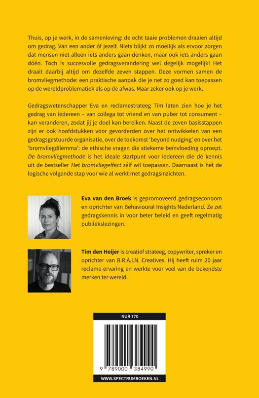 De bromvliegmethode is het ideale startpunt voor iedereen die de informatie uit de bestseller Het bromvliegeffect zélf wil toepassen en de logische volgende stap voor wie al aan het werk is met gedragsinzichten. Gedragswetenschapper Eva en reclamestrateeg Tim laten zien hoe je het gedrag van iedereen – van collega en vriend tot puber en consument – kan veranderen, zodat jij je doel kan bereiken.