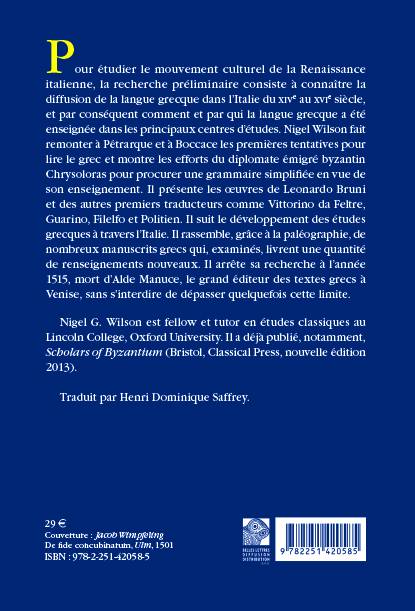 English summary: In order to trace the cultural development of the Italian Renaissance, the present volume examines the diffusion of Greek studies throughout the Peninsula over the course of the fourteenth and fifteenth centuries. Nigel Wilson sheds light on the role of Petrarch and Boccaccio in their efforts to learn Greek, as well as some of the first translators such as Vittorino da Feltre and Filelfo, culminating with the death of Aldo Manucio, the great Venetian editor of Greek texts, in 1515. French description: Pour etudier le mouvement culturel de la Renaissance italienne, la recherche preliminaire consiste a connaitre la diffusion de la langue grecque dans l'Italie du XIVe au XVIe siecles, et par consequent comment et par qui la langue grecque a ete enseignee dans les principaux centres d'etudes. Nigel Wilson fait remonter a Petrarque et a Boccace les premieres tentatives pour lire le grec et montre les efforts du diplomate emigre byzantin Chrysoloras pour procurer une grammaire simplifiee en vue de son enseignement. Il presente les oeuvres de Leonardo Bruni et des autres premiers traducteurs comme Vittorino da Feltre, Guarino, Filelfo et Politien. Il suit le developpement des etudes grecques a travers l'Italie. Il rassemble grace a la paleographie de nombreux manuscrits grecs qui, examines, livrent une quantite de renseignements nouveaux. Il arrete sa recherche a l'annee 1515, mort d'Alde Manuce, le grand editeur des textes grecs a Venise, sans s'interdire de depasser quelquefois cette limite.