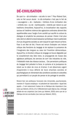 De quoi la « dé-civilisation » est-elle le nom ? Pour Roland Gori, cela ne fait aucun doute : la dé-civilisation n'est pas le fait de « sauvageons », de « barbares » héritiers d'une civilisation des « enfants rois » ou de « banlieusards » violents par nature ou par traditions émeutières. Aujourd'hui, la brutalisation des rapports sociaux et l'extrême violence des agressions ordinaires doivent être appréhendées sous l'angle d'une société qui sacrifie la culture du dialogue et empêche les processus de penser au profit d'une civilisation des moeurs. L'Autre n'est plus celui dont on attend la reconnaissance symbolique mais le partenaire d'un jeu de guerres sociales au sein duquel le sujet mesure sa force. Face à cet état de fait, l'heure est venue d'adopter une lecture critique des fonctions du langage et de replacer la puissance de l'imaginaire des langues au coeur de l'invention démocratique. Aujourd'hui la fonction critique du langage se trouve dégradée par le ruissellement des fake news, la propagande de masse des agitateurs politiques, les services de com' des industries du vide, l'infobésité virale des