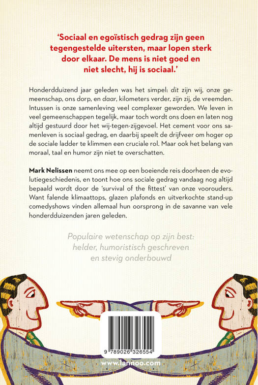 Populaire wetenschap op zijn best: helder, humoristisch en stevig onderbouwd 'Sociaal en egoïstisch gedrag zijn geen tegengestelde uitersten, maar lopen sterk door elkaar. De mens is niet goed en niet slecht, hij is sociaal.' Honderdduizend jaar geleden wat het simpel: dit zijn wij, onze gemeenschap, ons dorp, en daar, kilometers verder, zijn zij, de vreemden. Intussen is onze samenleving veel complexer geworden. We leven in veel gemeenschappen tegelijk, maar toch wordt ons doen en laten nog altijd gestuurd door het wij-tegen-zijgevoel. Het cement voor ons samenleven is sociaal gedrag, en daarbij speelt de drijfveer om hoger op de sociale ladder te klimmen een cruciale rol, net als moraal, taal en humor. Mark Nelissen neemt ons mee op een boeiende reis doorheen de evolutiegeschiedenis, en toont hoe ons sociale gedrag vandaag nog altijd bepaald wordt door de 'survival of the fittest' van onze voorouders. Want falende klimaattops, glazen plafonds en uitverkochte stand-up comedyshows vinden allemaal hun oorsprong in de savanne van vele honderdduizenden jaren geleden. Populaire wetenschap op zijn best: helder, humoristisch geschreven en stevig onderbouwd.