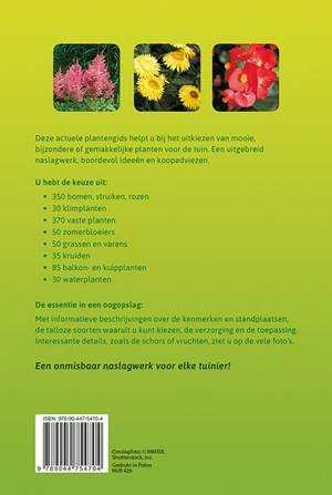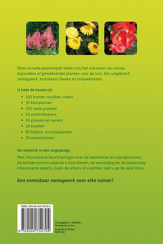 Deze actuele plantengids helpt u bij het uitkiezen van mooie, bijzondere of gemakkelijke planten voor de tuin. Een uitgebreid naslagwerk, boordevol ideeën en koopadviezen. U hebt de keuze uit: 350 bomen, struiken, rozen 30 klimplanten 370 vaste planten 50 zomerbloeiers 50 grassen en varens 35 kruiden 85 balkon- en kuipplanten 30 waterplanten De essentie in een oogopslag: Met informatieve beschrijvingen over de kenmerken en standplaatsen, de talloze soorten waaruit u kunt kiezen, de verzorging en de toepassing. Interessante details, zoals de schors of vruchten, ziet u op de vele foto's. Een onmisbaar naslagwerk voor elke tuinier!