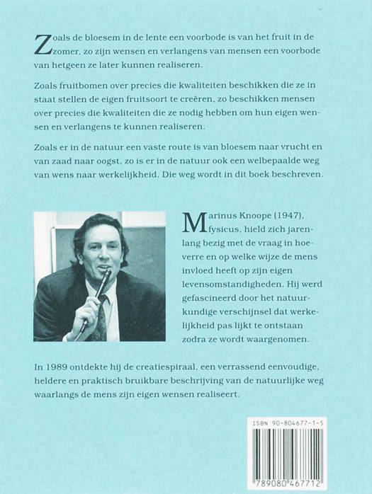 Zoals de bloesem in de lente een voorbode is van het fruit in de zomer, zo zijn wensen en verlangens van mensen een voorbode van hetgeen ze later kunnen realiseren. Zoals fruitbomen over precies die kwaliteiten beschikken die ze in staat stellen de eigen fruitsoort te creëren, zo beschikken mensen over precies die kwaliteiten die ze nodig hebben om hun eigen wensen en verlangens te kunnen realiseren. Zoals er in de natuur een vaste route is van bloesem naar vrucht en van zaad naar oogst, zo is er in de natuur ook een welbepaalde weg van wens naar werkelijkheid. Die weg wordt in dit boek beschreven. Marinus Knoope (1947), fysicus. hield zich jarenlang bezig met de vraag in hoeverre en op welke wijze de mens invloed heeft op zijn eigen levensomstandigheden. Hij werd gefascineerd door het natuurkundige verschijnsel dat werkelijkheid pas lijkt te ontstaan zodra ze wordt waargenomen. In 1989 ontdekte hij de creatiespiraal, een verrassend eenvoudige, heldere en praktisch bruikbare beschrijving van de natuurlijke weg waarlangs de mens zijn eigen wensen realiseert.