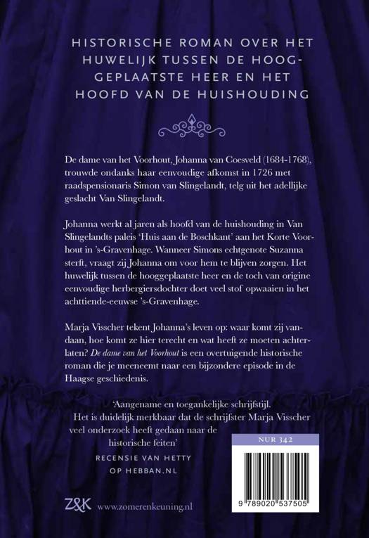 'De dame van het Voorhout' in deze historische roman van Marja Visscher is Johanna van Coesvelt (1684-1768). Ondanks haar ietwat simpele komaf trouwde zij in 1726 met raadspensionaris Simon van Slingelandt. Ze werkt op dat moment als huishoudster in zijn paleis aan het Korte Voorhout. Wanneer Simons vrouw Suzanna sterft, vraagt zij Johanna voor hem te zorgen. Het huwelijk tussen de hooggeplaatste heer en zijn huishoudster doet veel stof opwaaien in het 18e-eeuwse Den Haag. Marja Visscher tekent Johanna's leven op: waar kwam deze vrouw vandaan, hoe kwam ze hier terecht en wat heeft ze moeten achterlaten? 'De dame van het Voorhout' is een overtuigende historische roman, waarvoor Marja Visscher gedegen historisch onderzoek deed.
