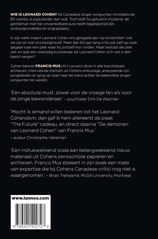 Een unieke kijk in de ziel van Leonard Cohen Wie is Leonard Cohen? De Canadese singer-songwriter, inmiddels de 80 voorbij, is populairder dan ooit. Toch blijft hij gehuld in mysterie: de gentleman met het onwankelbare aura heeft tegelijkertijd iets ondoorgrondelijks en ongrijpbaars. In zijn werk maant Leonard Cohen ons geregeld aan om 'op te biechten' wie we zijn en wat ons bezighoudt. Meer dan 60 jaar lang is hij ook zelf op zoek gegaan naar een plek waar hij zichzelf kon vinden. Maar bestaat die plek wel, en laat een veelzijdig kunstenaar als Leonard Cohen zich wel in één beeld vangen? Cohen-kenner Francis Mus (KU Leuven) dook in alle beschikbare archieven, interviewde mensen uit Cohens entourage, analyseerde zijn songteksten en ging op zoek naar de mens achter de bekendste singer-songwriter ter wereld.
