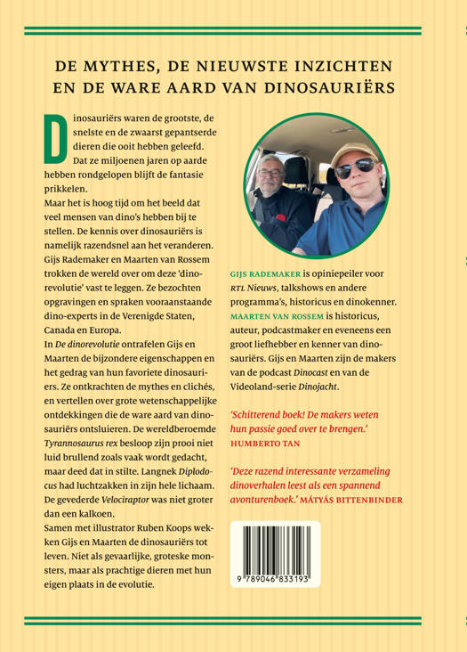 'Schitterend boek! De makers weten hun passie goed over te brengen.' Humberto Tan 'Deze razend interessante verzameling dinoverhalen leest als een spannend avonturenboek.' Mátyás Bittenbinder 'Lezenswaardige mix van feitjes, prachtige illustraties en verder kijk- en leestips.' New Scientist 'Heerlijk boek […] Hele mooie illustraties en goede verhalen.' Dolf Jansen in Spijkers Met Koppen De kennis over dinosauriërs is razendsnel aan het veranderen. Gijs Rademaker en Maarten van Rossem trokken de wereld over om deze 'dinorevolutie' vast te leggen. Ze bezochten opgravingen en spraken vooraanstaande dino-experts in de Verenigde Staten, Canada en Europa. In De dinorevolutie ontrafelen Gijs en Maarten de bijzondere eigenschappen en het gedrag van hun favoriete dinosauriërs. Ze ontkrachten de mythes en clichés, en vertellen over grote wetenschappelijke ontdekkingen die de ware aard van dinosauriërs ontsluieren. De wereldberoemde Tyrannosaurus rex besloop zijn prooi niet luid brullend zoals vaak wordt gedacht, maar deed dat in stilte. Langnek Diplodocus had luchtzakken in zijn hele lichaam. De gevederde Velociraptor was niet groter dan een kalkoen. Samen met illustrator Ruben Koops wekken Gijs en Maarten de dinosauriërs tot leven. Niet als gevaarlijke, groteske monsters, maar als prachtige dieren met hun eigen plaats in de evolutie.