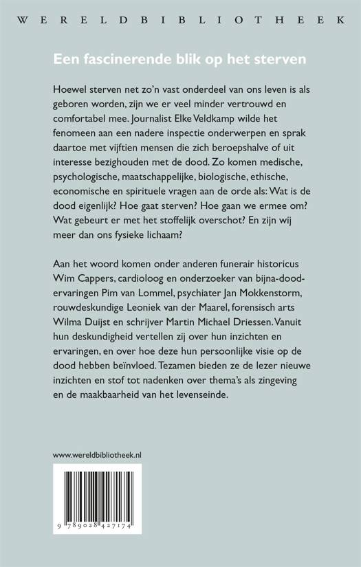 De dood heeft allerlei facetten, praktische, medische en filosofische, die deel uitmaken van het leven zonder dat we ons daarvan bewust zijn. Journalist Elke Veldkamp wilde weten welke en sprak daartoe met vijftien mensen die zich beroepshalve of uit interesse met de dood bezighouden. Zo komen onder meer medische, psychologische, maatschappelijke, biologische, economische en spirituele vragen aan de orde als: Wat is de dood eigenlijk? Hoe gaat sterven? Hoe gaan we ermee om? Wat gebeurt er met het stoffelijk overschot? En zijn wij meer dan ons fysieke lichaam? Aan het woord komen onder anderen funerair historicus Wim Cappers, cardioloog Pim van Lommel, psychiater Jan Mokkenstorm, rouwdeskundige Leonie van der Maarel, forensisch arts Wilma Duijst en schrijver Martin Michael Driessen. Vanuit hun deskundigheid vertellen zij over hun inzichten en ervaringen, en over hoe deze hun persoonlijke visie op de dood hebben beïnvloed.