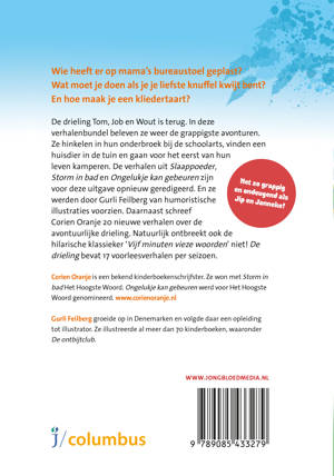 De drieling Tom, Job en Wout is terug. In deze verhalenbundel beleven ze weer de grappigste avonturen. Ze hinkelen in hun onderbroek bij de schoolarts, vinden een huisdier in de tuin en gaan voor het eerst van hun leven kamperen. De verhalen uit Slaappoeder, Storm in bad en Ongelukje kan gebeuren zijn voor deze uitgave opnieuw geredigeerd. En ze werden door Gurli Feilberg van humoristische illustraties voorzien. Daarnaast schreef Corien Oranje 20 nieuwe verhalen over de avontuurlijke drieling. Natuurlijk ontbreekt ook de hilarische klassieker 'Vijf minuten vieze woorden' niet! De drieling bevat 17 voorleesverhalen per seizoen.