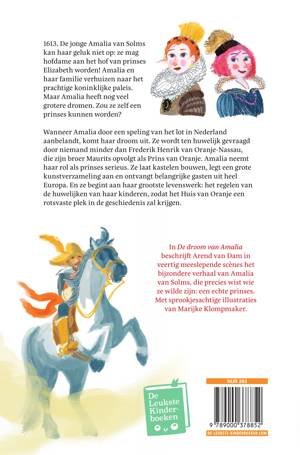 In 1621 komt Amalia van Solms, een arme gravin uit het hof van de koningin van Bohemen, bij toeval in Nederland terecht. Ze kan haar geluk niet op als ze ten huwelijk gevraagd wordt door Frederik Hendrik van Oranje-Nassau. Niet alleen is haar leven in armoede voorbij, haar nieuwe leven als prinses past haar perfect. Algauw schudt Amalia het stadhouderlijk hof wakker. Ze laat paleizen bouwen, legt een grote kunstverzameling aan en ontvangt belangrijke buitenlandse gasten. En ze begint aan haar grootste levenswerk: het regelen van de huwelijken van haar kinderen, in de hoop dat zij nooit de armoede zullen meemaken die ze zelf ooit heeft gekend. In De droom van Amalia beschrijft Arend van Dam in 40 meeslepende, filmische scènes het verhaal van een vrouw die precies weet wie ze is: een echte prinses. Met sprookjesachtige illustraties van Marijke Klompmaker.