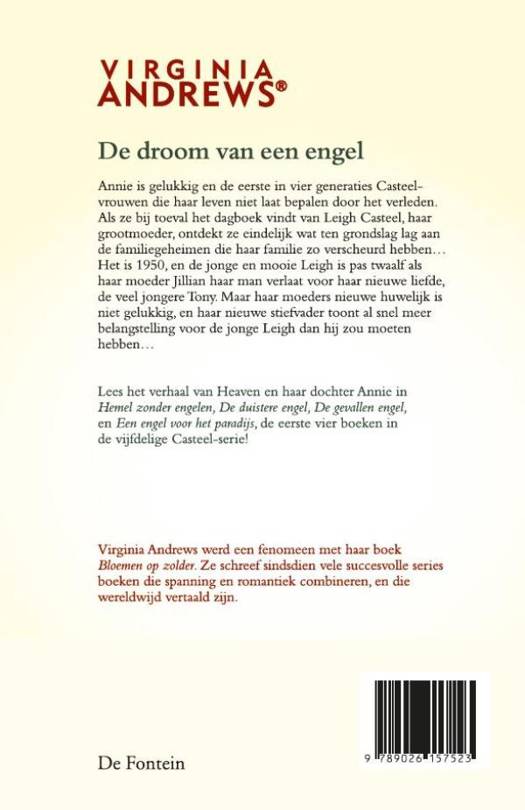 'De droom van een engel' is het vijfde en laatste boek in de vijfdelige Casteel-serie van Virginia Andrews. Annie is gelukkig en de eerste in vier generaties Casteel-vrouwen die haar leven niet laat bepalen door het verleden. Als ze bij toeval het dagboek vindt van Leigh Casteel, haar grootmoeder, ontdekt ze eindelijk wat ten grondslag lag aan de familiegeheimen die haar familie zo verscheurd hebben… Het is 1950, en de jonge en mooie Leigh is pas twaalf als haar moeder Jillian haar man verlaat voor haar nieuwe liefde, de veel jongere Tony. Maar haar moeders nieuwe huwelijk is niet gelukkig, en haar nieuwe stiefvader toont al snel meer belangstelling voor de jonge Leigh dan hij zou moeten hebben… 'De droom van een engel' neemt de lezer mee terug in de tijd naar de jaren vóór 'Hemel zonder engelen', naar het leven van Leigh Casteel en het familiegeheim dat de generaties na haar zou vormen… Lees het verhaal van Heaven en haar dochter Annie in 'Hemel zonder engelen', 'De duistere engel', 'De gevallen engel', en 'Een engel voor het paradijs', de eerste vier boeken in de vijfdelige Casteel-serie!